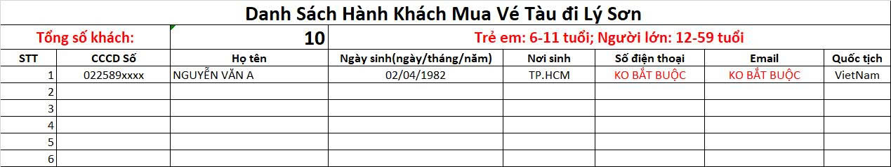 Mẫu thông tin hành khách cần cung cấp: Có thể gởi ảnh CCCD từng hành khách (cả 2 mặt nếu là người cao tuổi trên 60, người nước ngoài gởi 2 ảnh trước và sau Visa/Passport)
