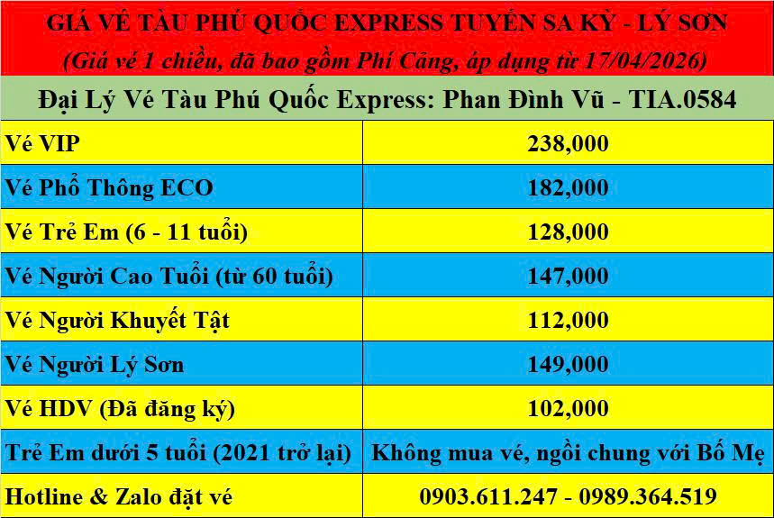 BẢNG GIÁ VÉ TÀU PHÚ QUỐC EXPRESS TUYẾN SA KỲ - LÝ SƠN