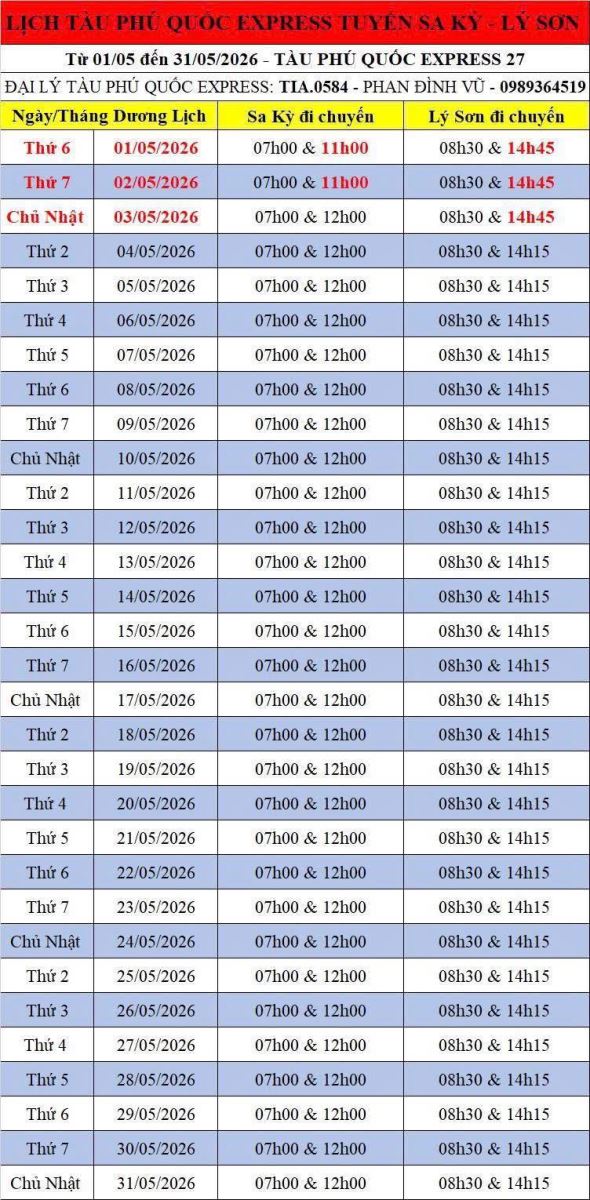 Lịch Tàu - Giá Vé - Hướng dẫn mua Vé Tàu Phú Quốc Express tuyến Sa Kỳ - Lý Sơn tháng 05/2026