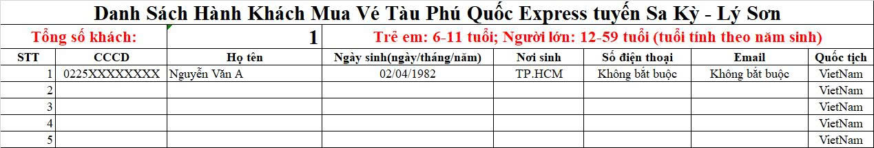 MẪU FORM THÔNG TIN HÀNH KHÁCH MUA VÉ TÀU PHÚ QUỐC EXPRESS