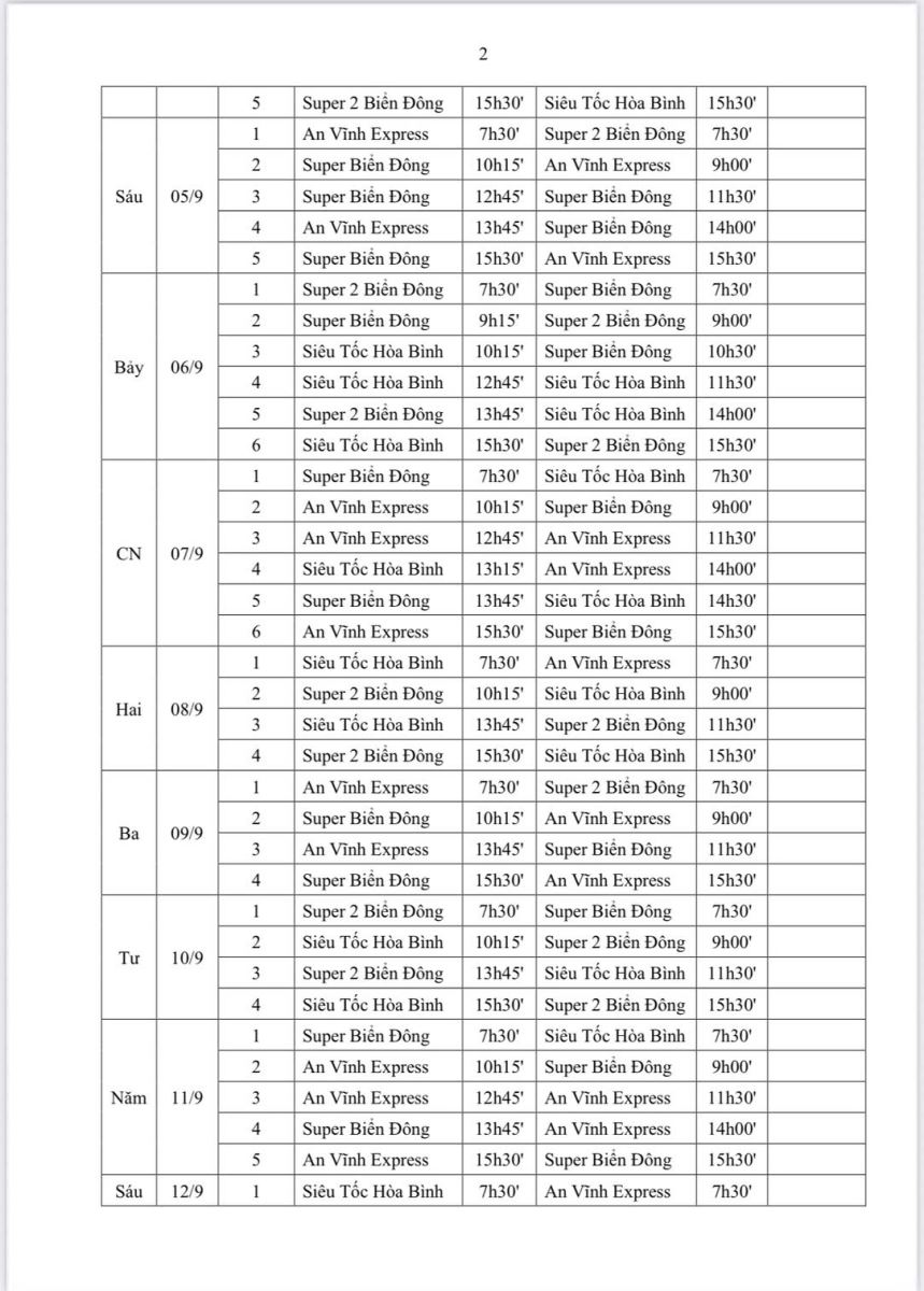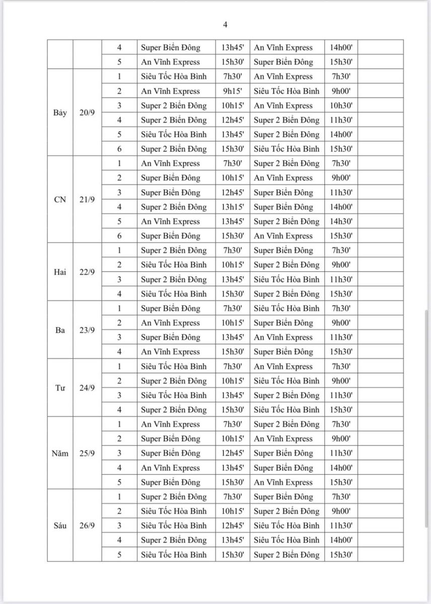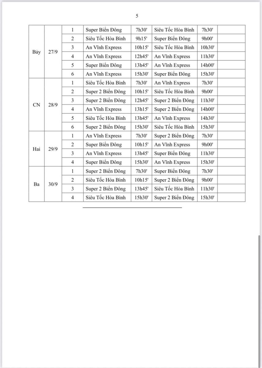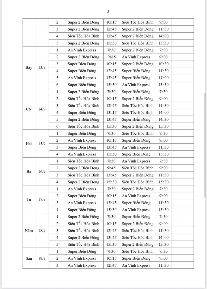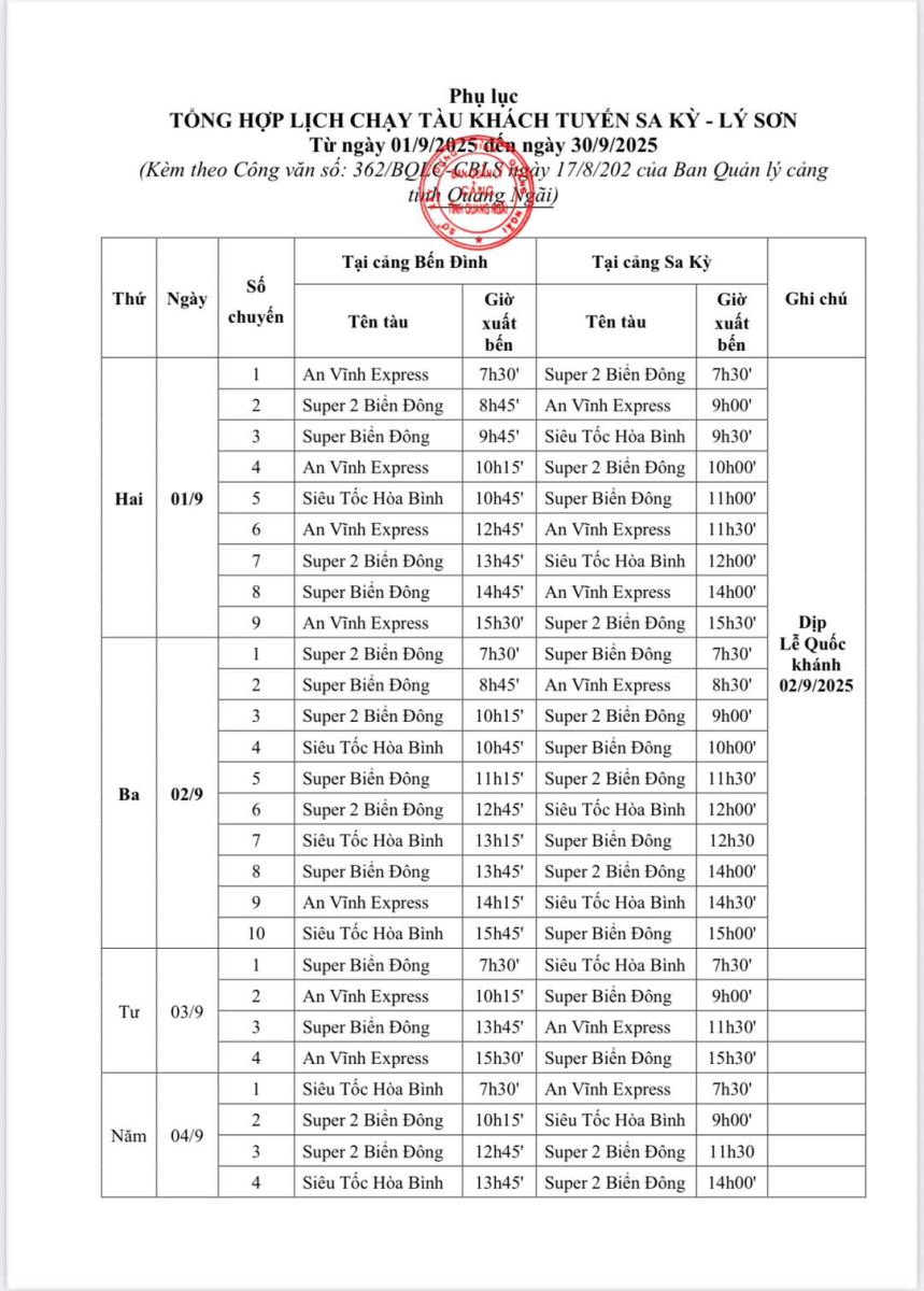 Lịch tàu đi Đảo Lý Sơn tháng 9 năm 2025 được thể hiện trong lịch bảng biểu sau (tuỳ tình hình thực tế khai thác và thời tiết sẽ có sự điều chỉnh phù hợp):